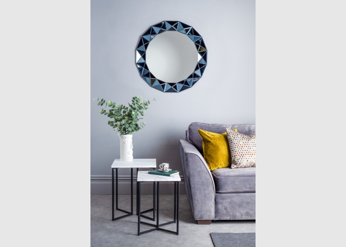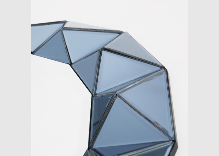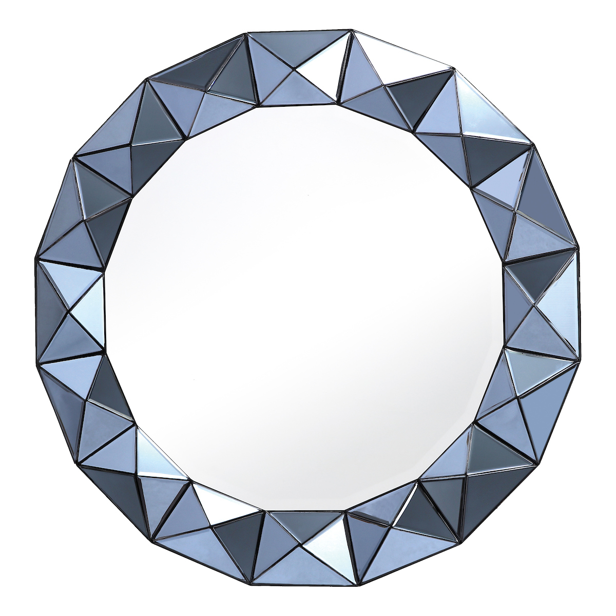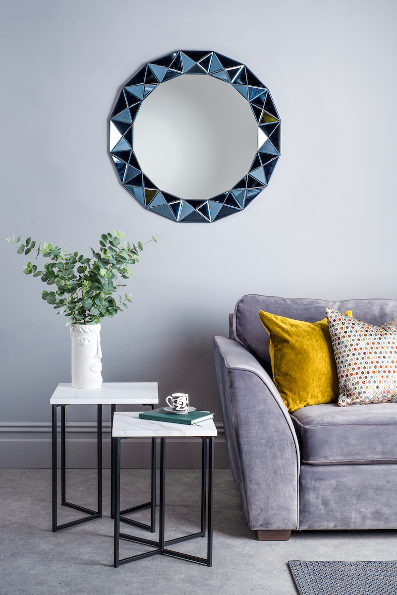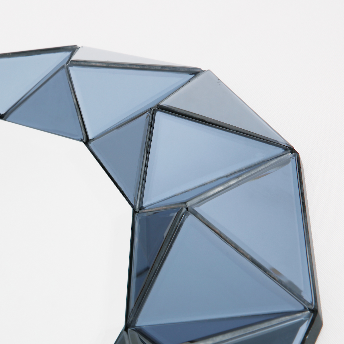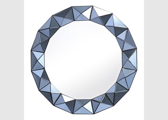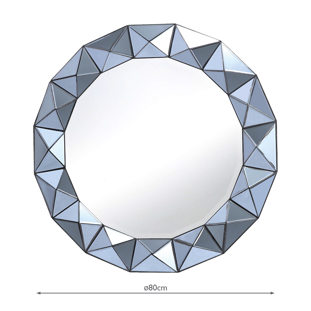 The large round Cetara Smoked Grey Mirror has a stunning faceted frame. The main mirror is surrounded by triangular facets of smoked mirror, giving a three-dimensional sculptured effect.