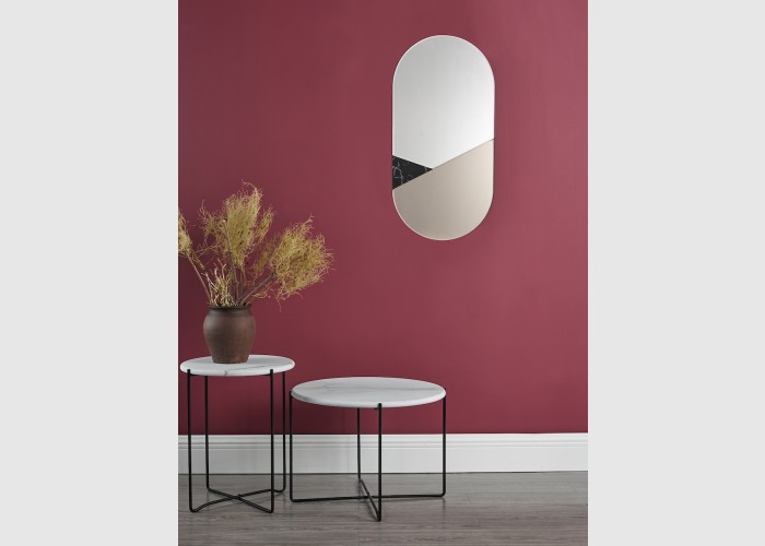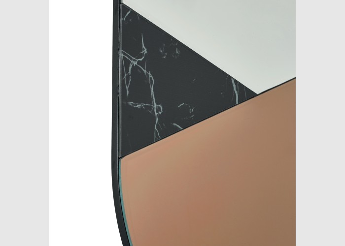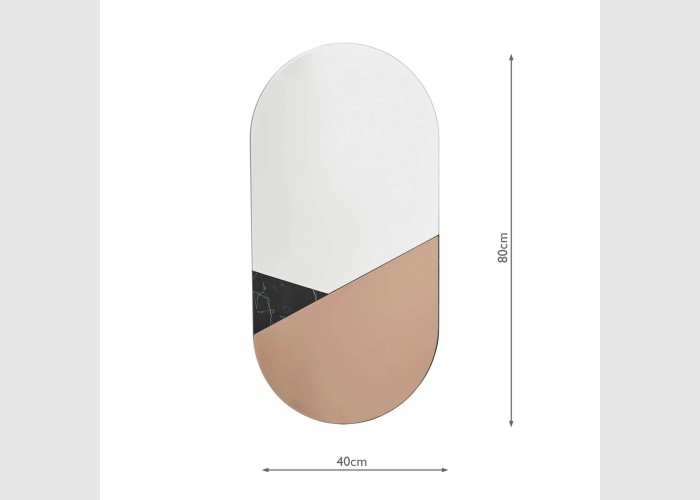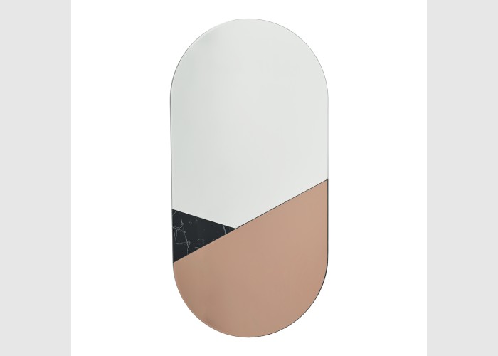 The Jalisa Oval Mirror is a large lozenge shaped mirror with a geometric form featuring a trio of bevelled pieces in clear mirror, rose gold mirror and black marble effect. It is a nicely proportioned mirror perfect for the smaller space.