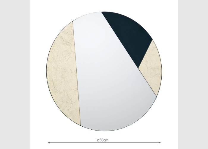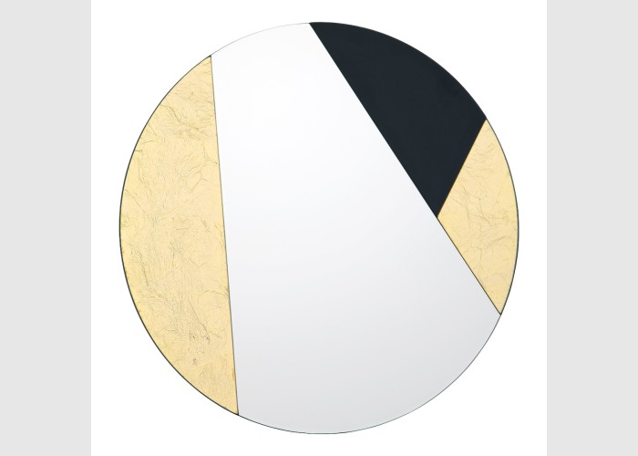 A round mirror intersected by strong diagonal geometry. The Jonna Round Mirror features glass segments backed with mirror, gold leaf detailing and black gloss. Inspired by mid-century design, this mirror will be an eye-catching addition to your home.