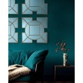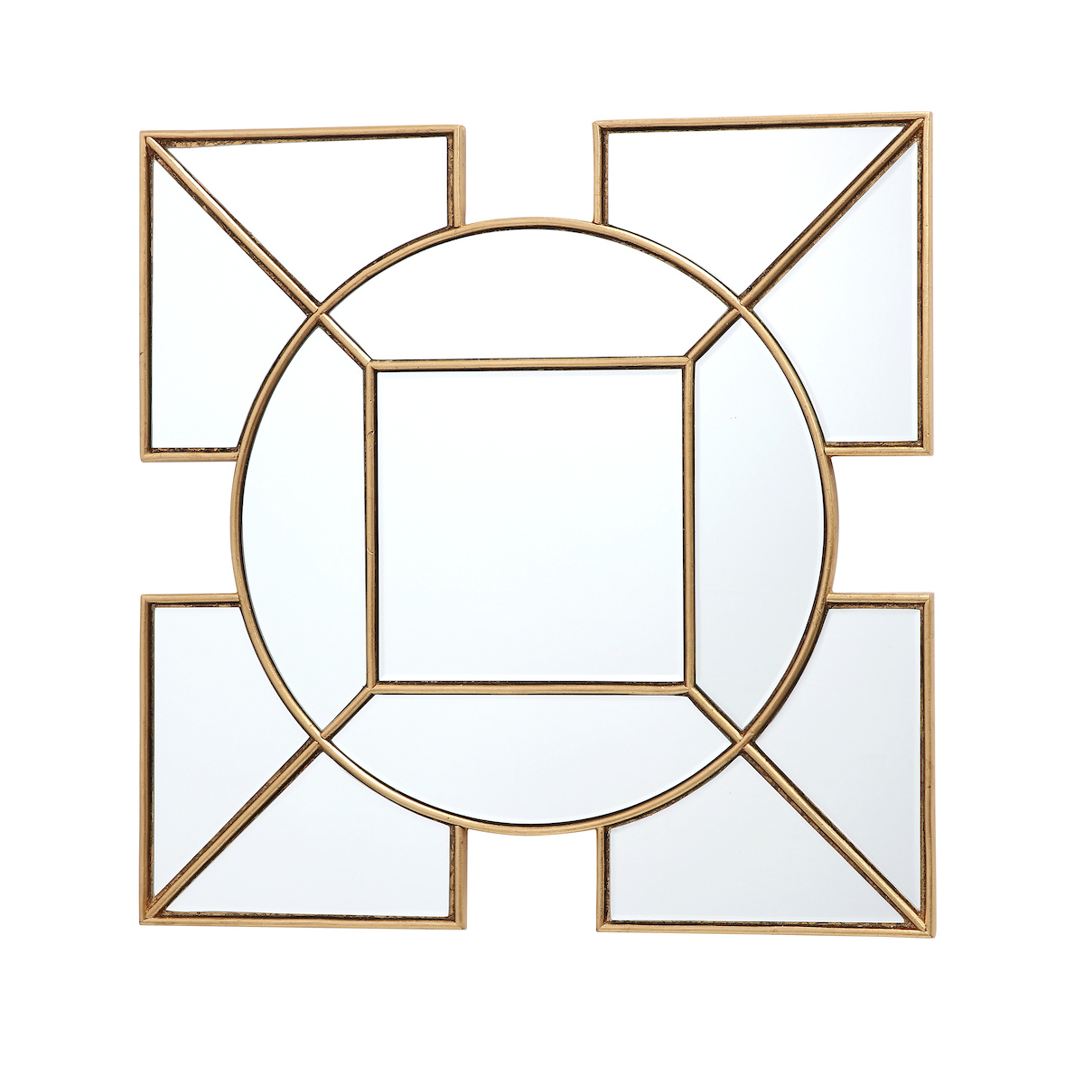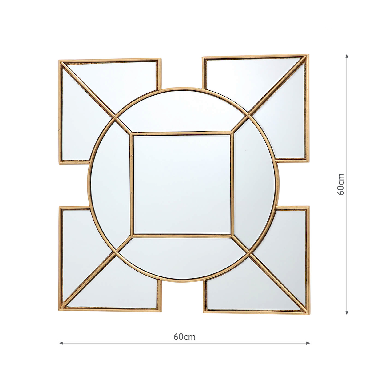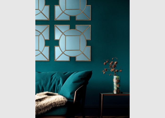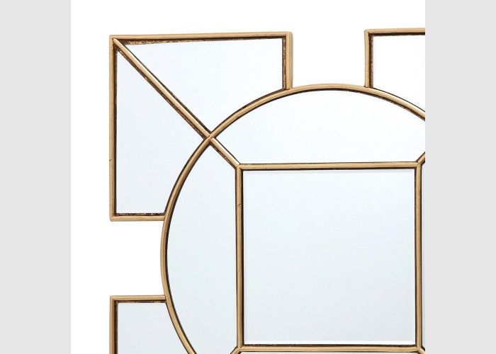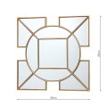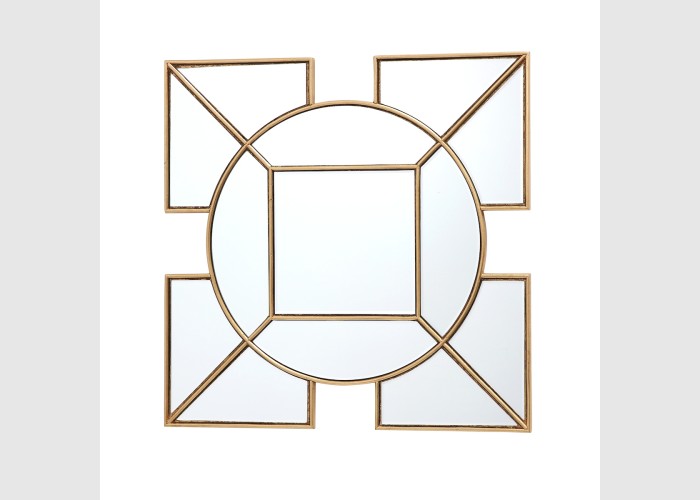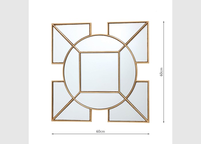 The Art Deco inspired Lyshia Square Mirror features a beautiful design with 4 squares surrounding the central round mirror. Complete with gold foil detail, creating a striking decorative mirror that will add a warming touch to any living space.