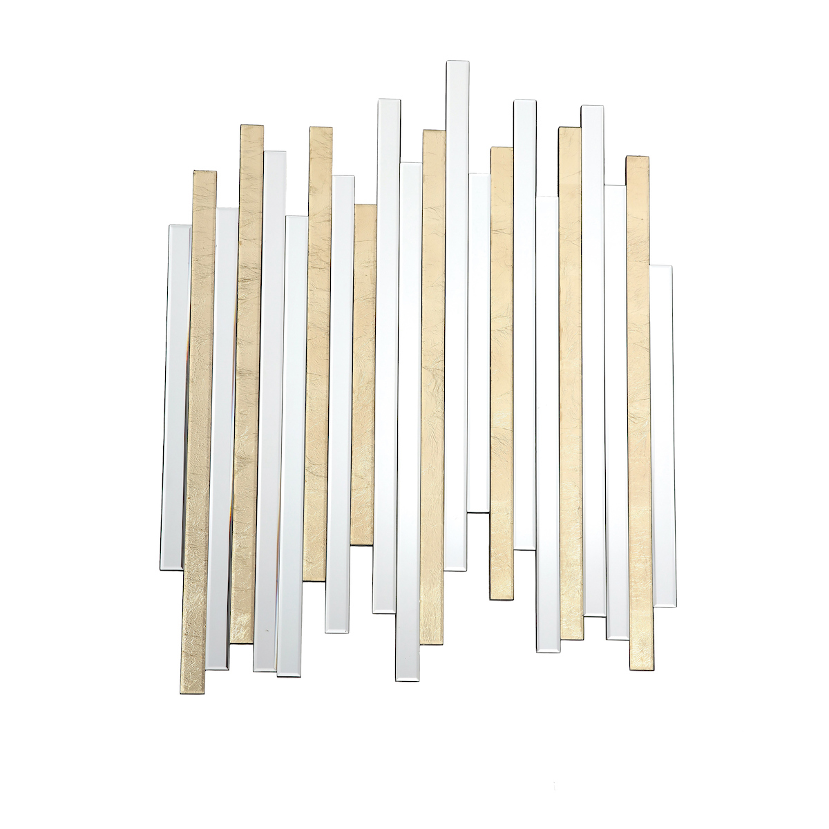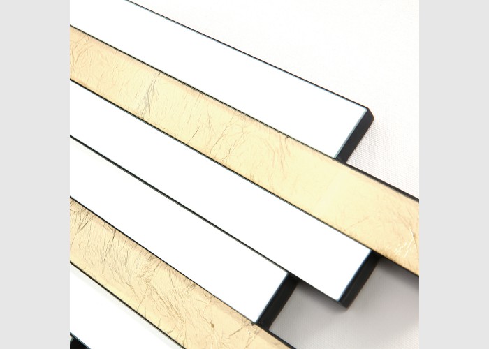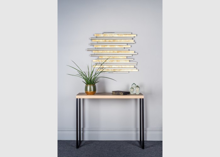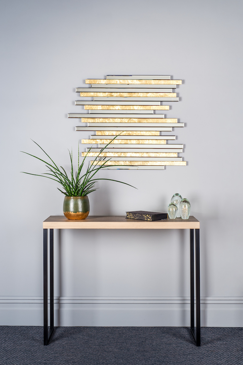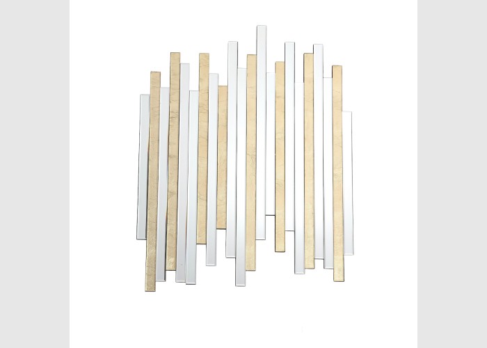 For a highly decorative sophisticated finishing touch to your living space, consider the novel Pimento Mirror. It features a staggered design of vertically arranged slender mirrored and gold leaf foil detailed slices, roughly forming a rectangle. More wall art than mirror, the warmth of the gold foil combined with the light-reflective mirror will add interest to a plain wall in any room.