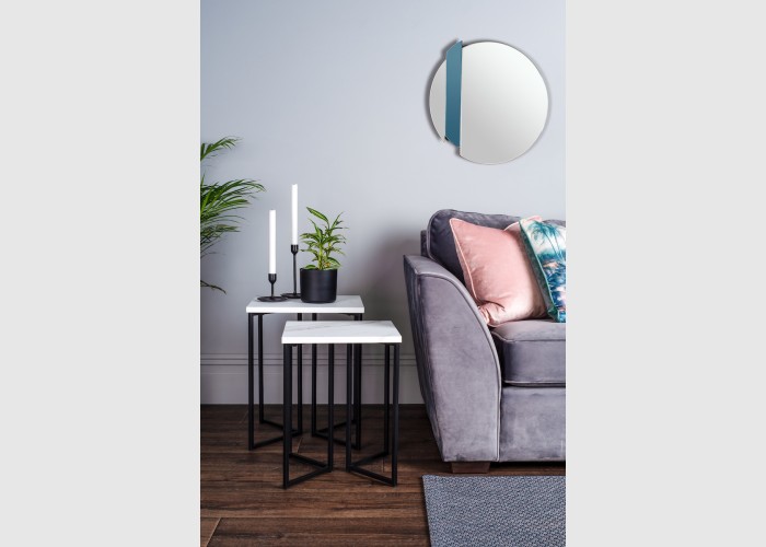 The Yulia Mirror is a round mirror intersected by a single strip of smoked finish mirrored glass. Inspired by mid-century design, the striking mirror will be an eye-catching addition to your home.