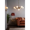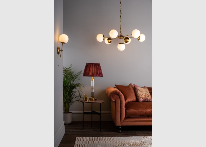 The Bombazine 7 Light Pendant is an amazing oversized ceiling light with large opal white glass globes mounted on a natural brass frame hanging from a chain suspension. It is equally at home close up to the ceiling or on a long chain drop.