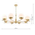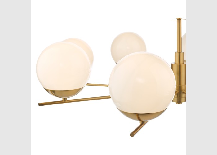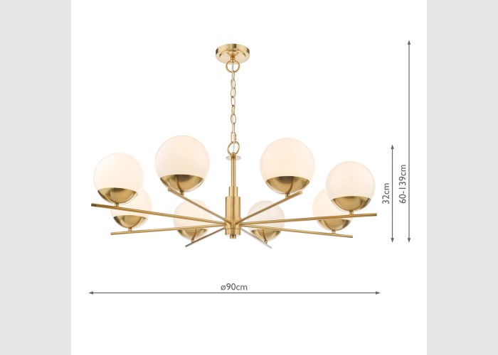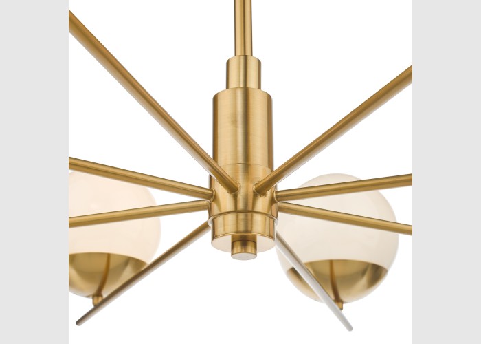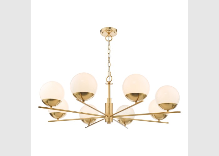 The Bombazine 8 Light Ceiling Pendant is inspired by mid century atomic design. This design era was heavily inspired by the space race. This design features a flat sputnik light structure with oversized opal glass shades perching on fine radiating arms.