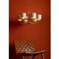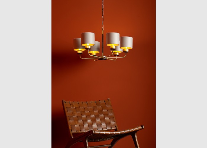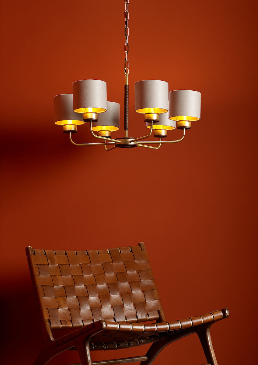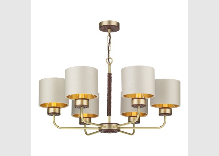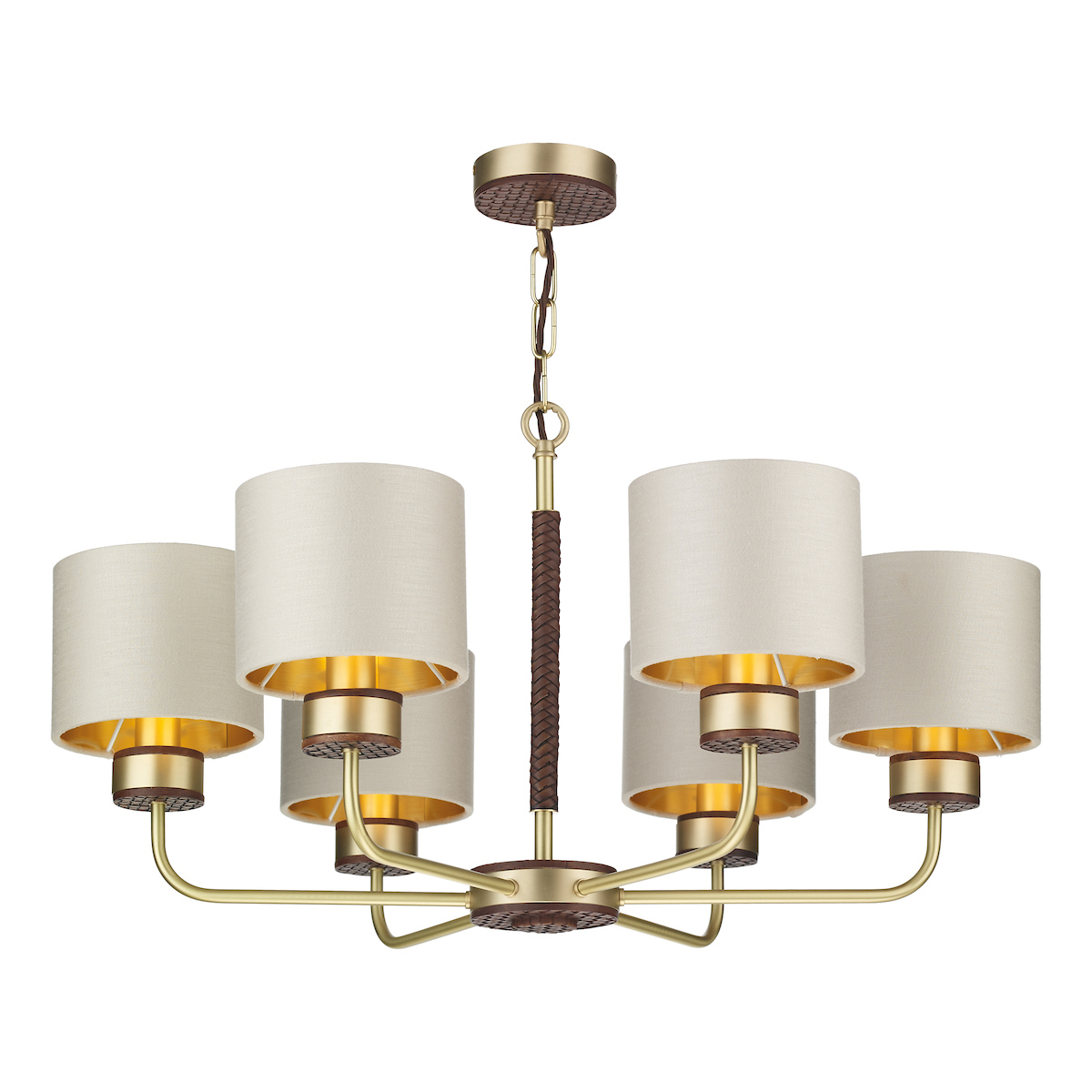 The David Hunt Hunter 6 Light Chandelier is from an original collection of lighting with a distinctive woven leather effect finish and butter brass metal work. Supplied complete with six contemporary limestone linen shades with a hard backed gold metallic lining.
