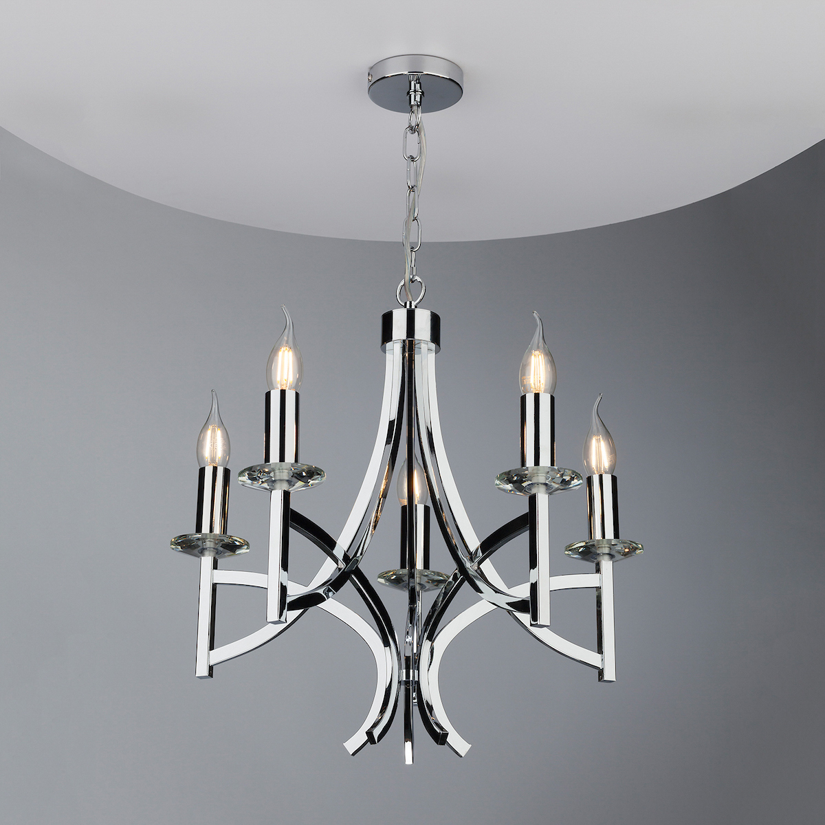The Lyon 5 Light Pendant has five faceted crystal bobeches sitting atop sweeping and intersecting arms to create this modern take on a classical chandelier. A bobeche is a collar originally intended to catch the drips of wax on a candlestick; here they add a touch of authenticity to our contemporary design.