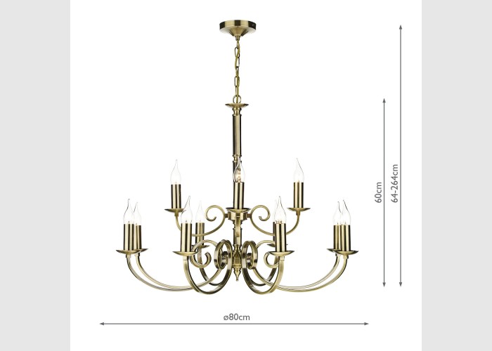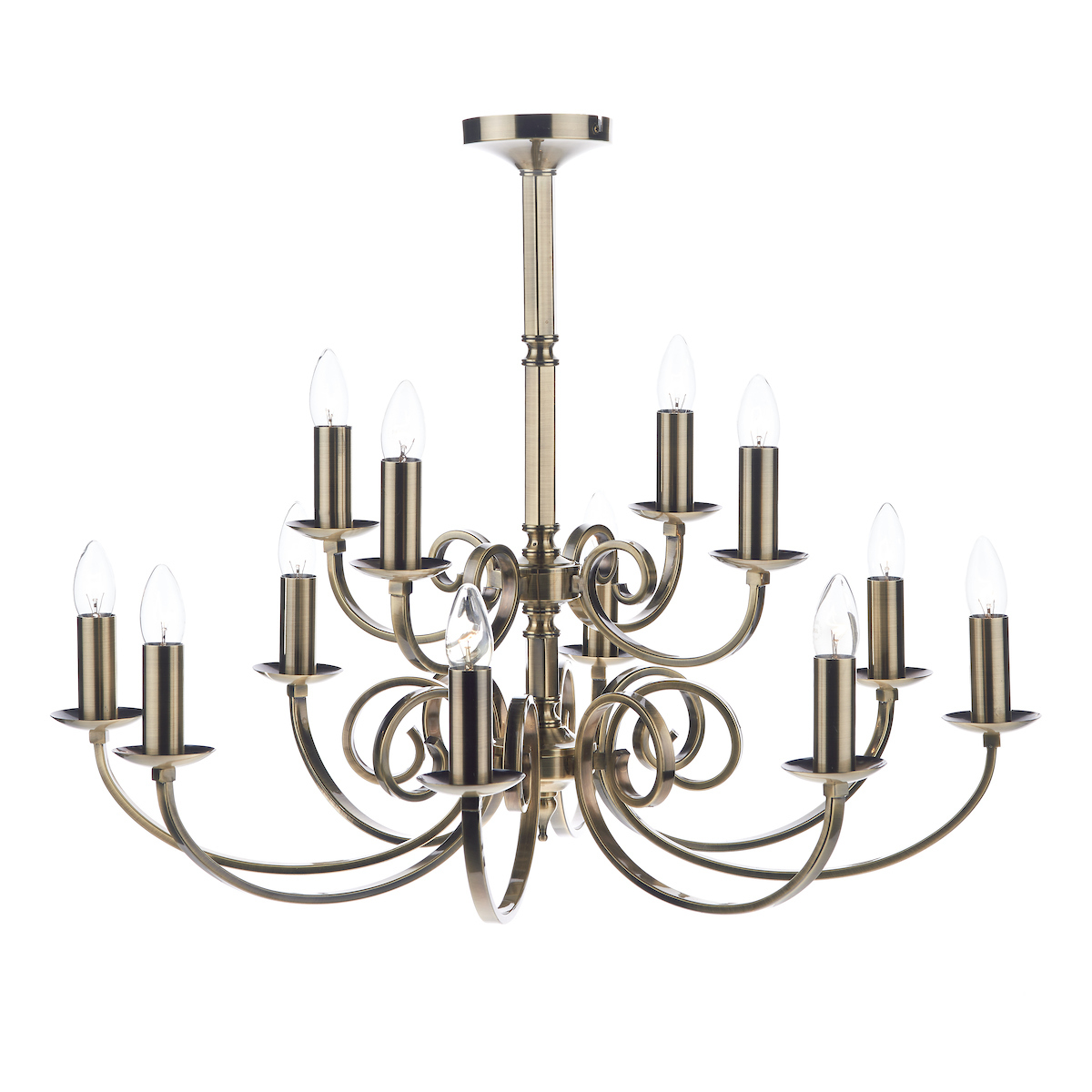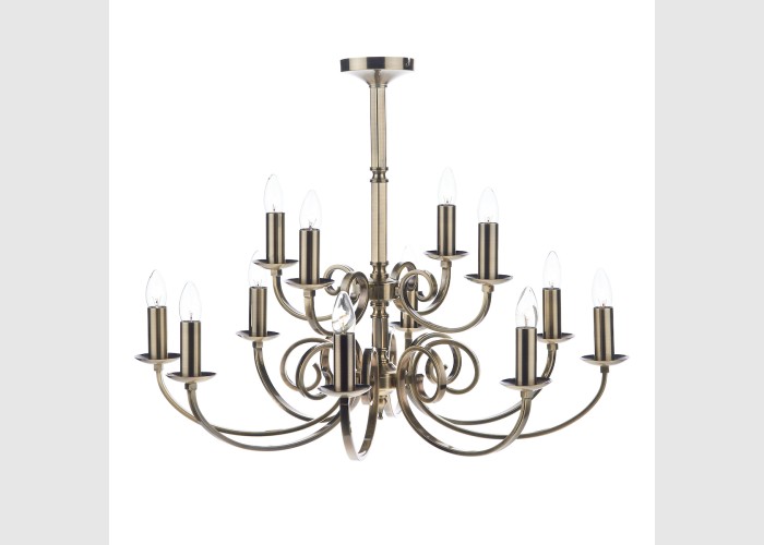 The Murray 12 Light Pendant is finished in antique brass and is arranged over two tiers.
