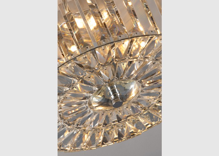 This opulent art deco inspired style will help bounce light around the room and is suspended from a circular frame in bright polished chrome.