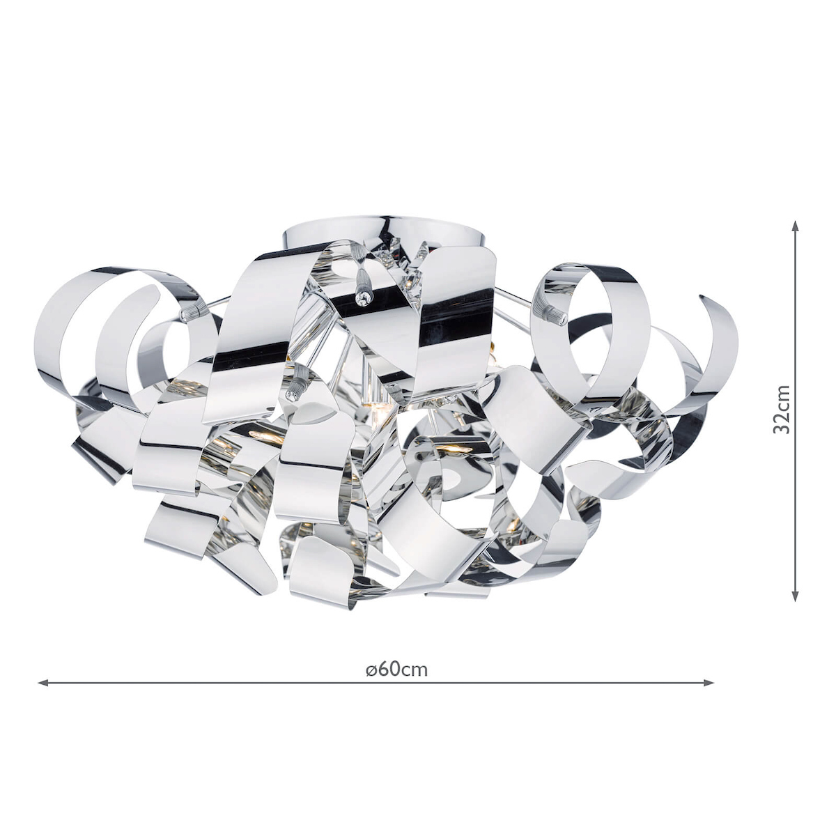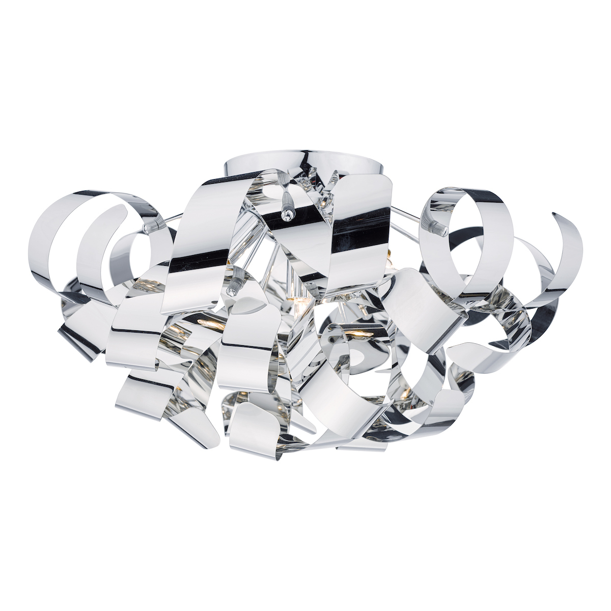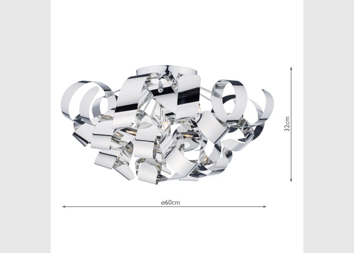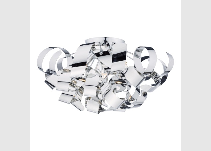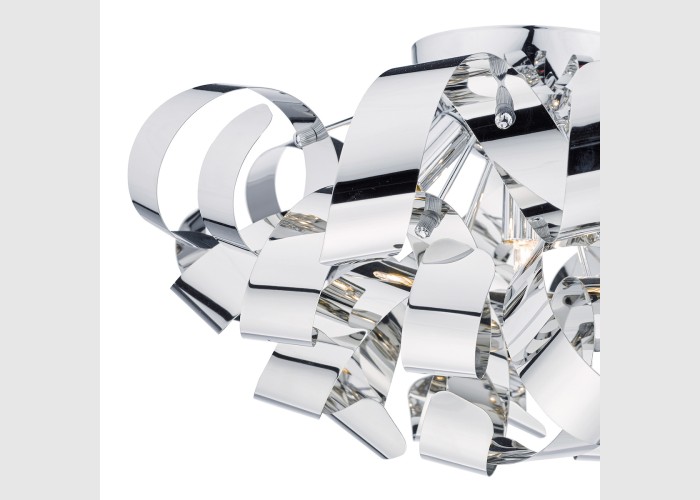 The Rawley 5 Light Flush features twirling ribbons of polished chrome around a polished chrome frame.