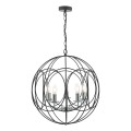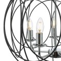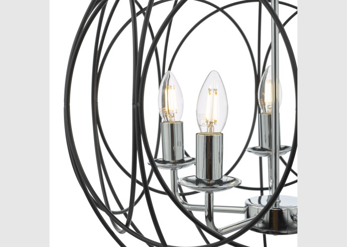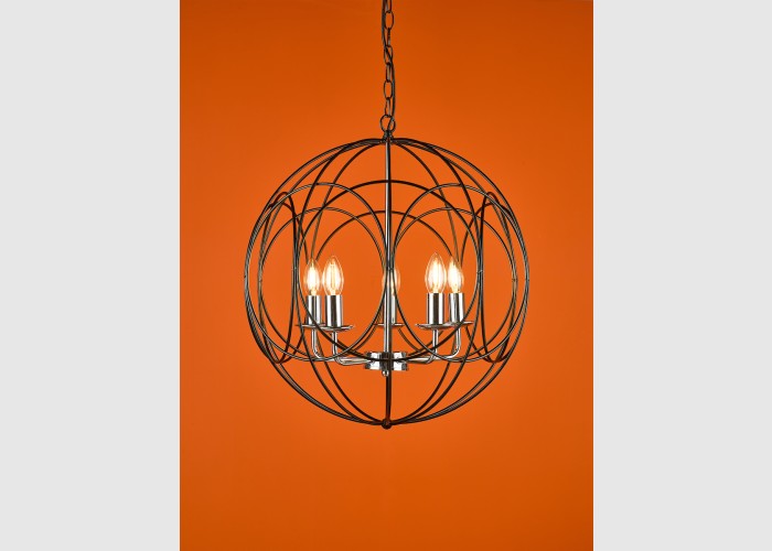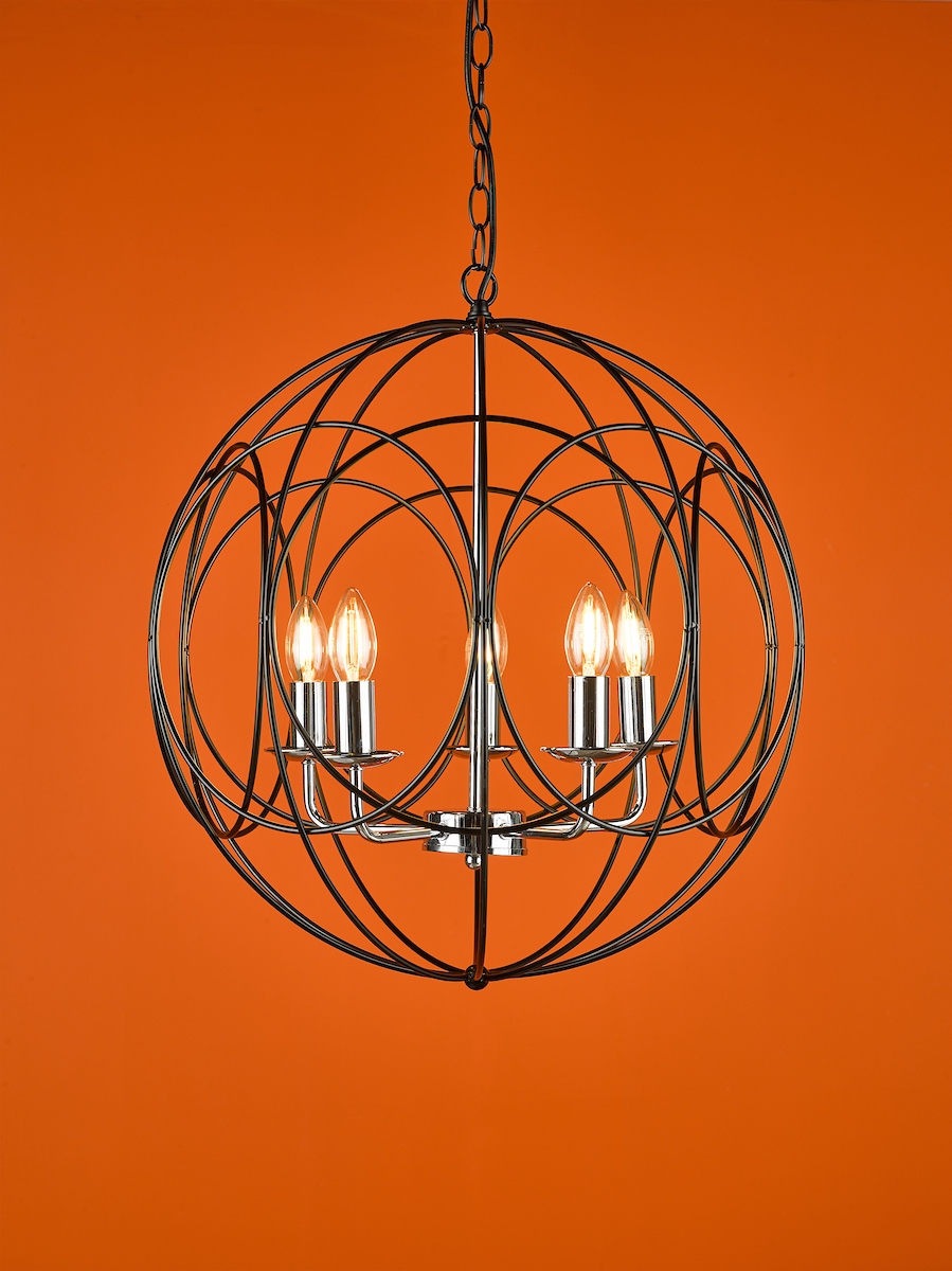 The Phoenix 5 Light Pendant in polished chrome is surrounded by a matte black looped frame. creating a contemporary graphic like appearance.