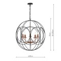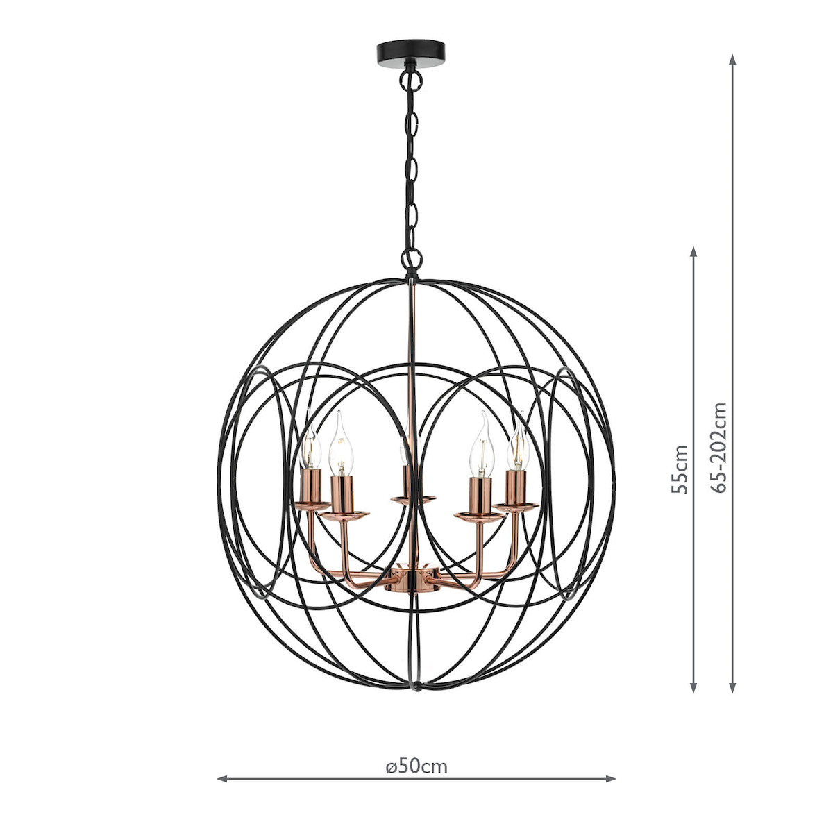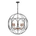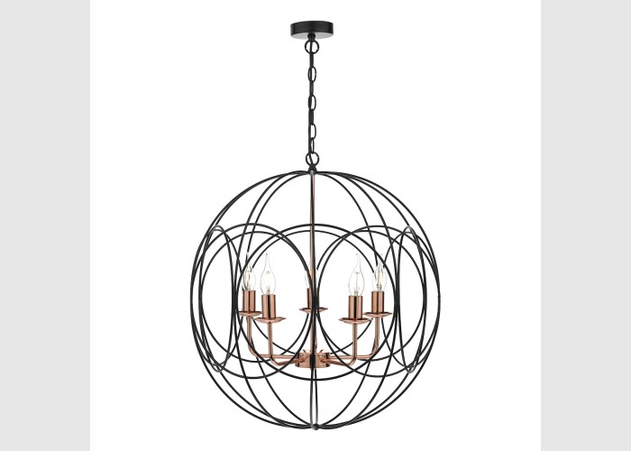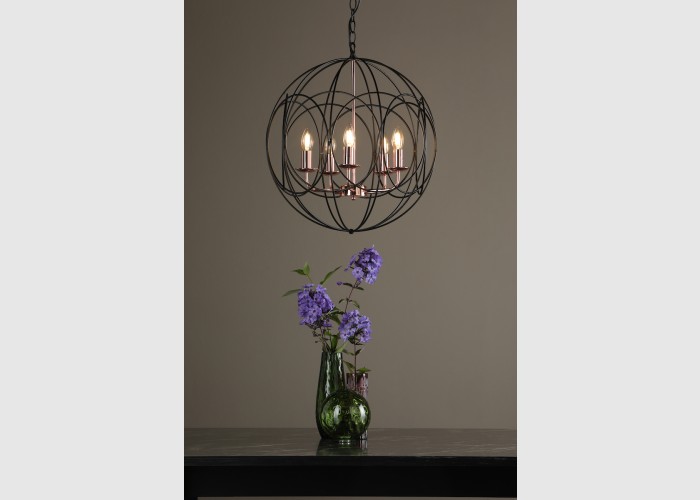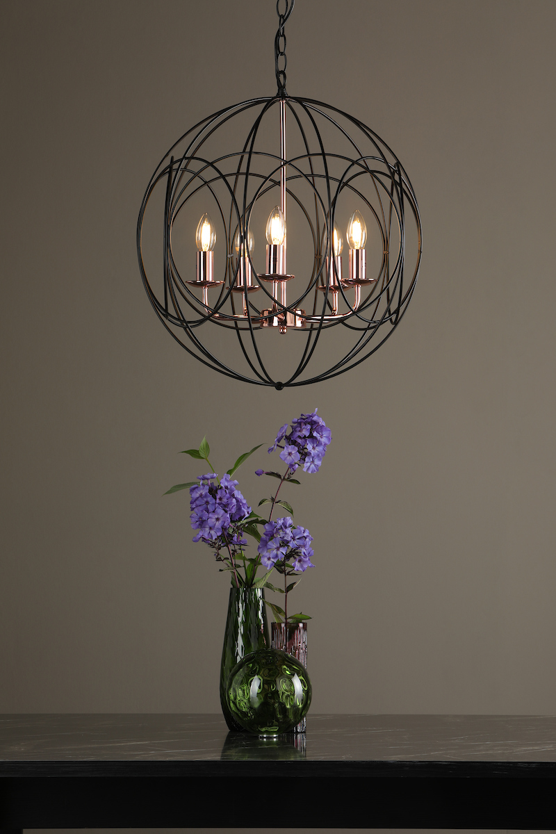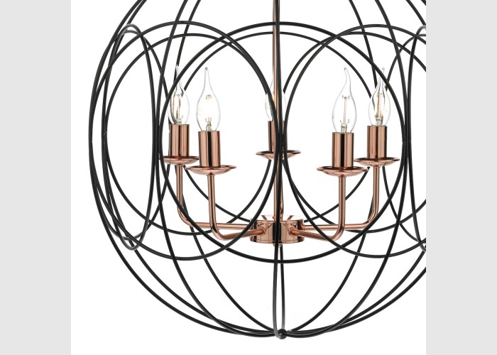 The Phoenix 5 Light Pendant in polished copper is surrounded by a matte black looped frame.