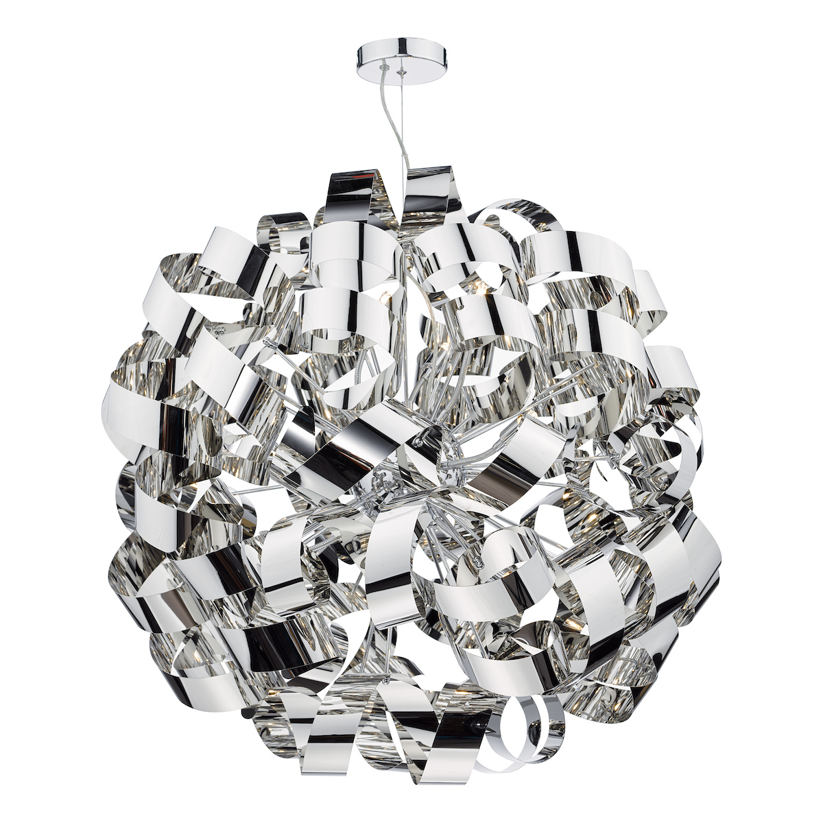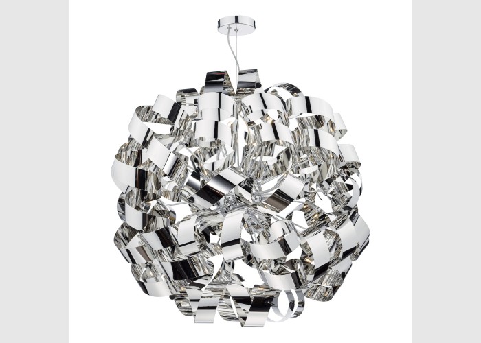The Rawley 12 Light Pendant features twirling ribbons of polished chrome around a polished chrome frame.