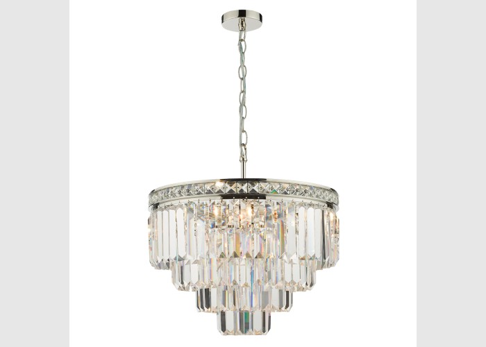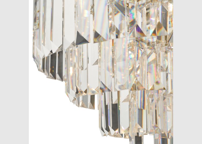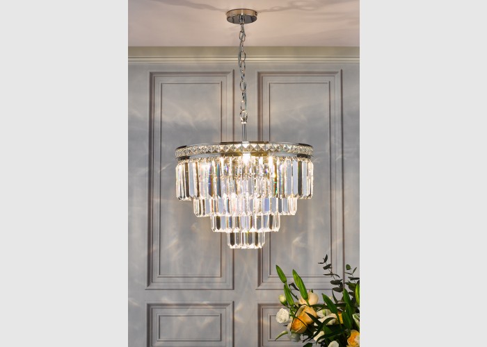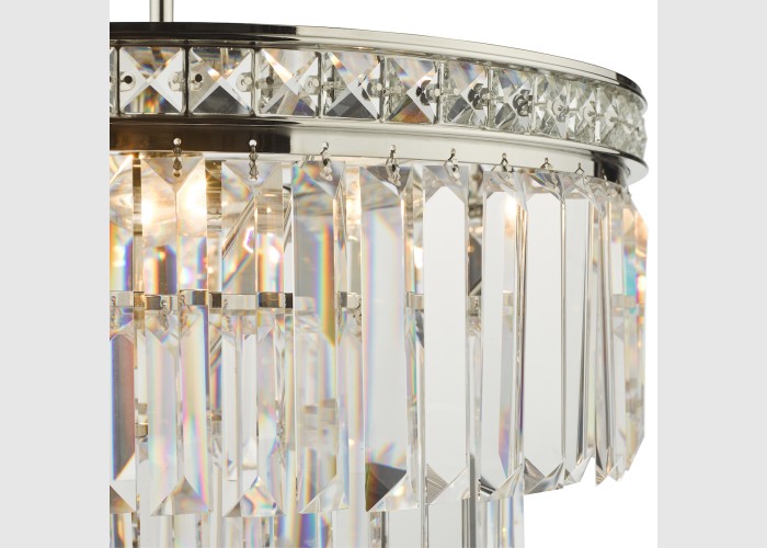 The Vyana 4 Light Pendant is classic crystal pendant with a polished nickel ceiling plate and frame inset with faceted crystal squares and 4 luxury layers of heavy cascading crystal droppers.