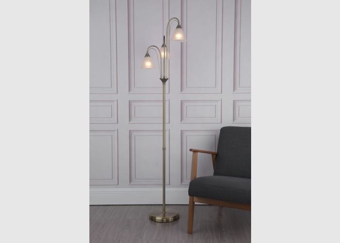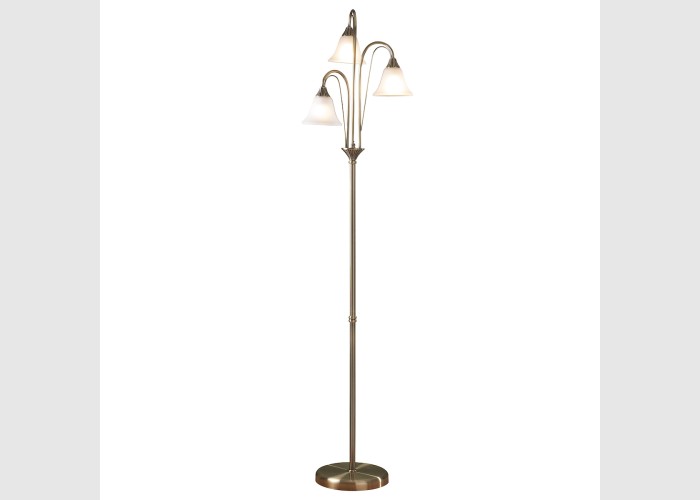 The Boston 3 Light Floor Lamp has a traditional feel in an antique brass finish with flared opal glass shades and ribbed detailing on the metalwork.