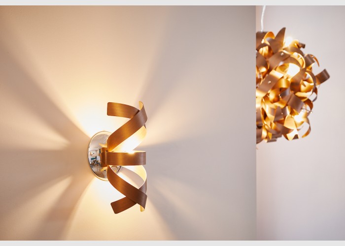 The Rawley 1 Light Wall bracket features twirling ribbons of brushed copper on a polished chrome plate.